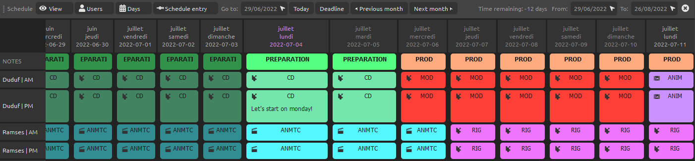 - Project Planning: a simple but indispensable tool to easily plan the production of the project, at the very beginning of the production. With this planning tool you will be able to set the important dates of the production, the deadlines for each step, all in an easy-to-use and visual panel.