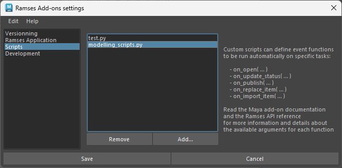 This way, the Add-on will automatically run your functions during these specific events, like when opening a file, publishing an asset, importing an asset, etc. The list of available events is documented in the Ramses API Reference