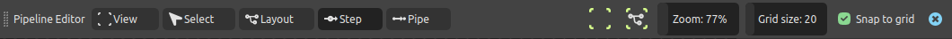The pipeline editor has three main areas: the toolbar on top contains a few useful menus and tools, the nodal view is where steps and pipes are connected, and the dock shows the editors (on the right side of the nocal view by default).