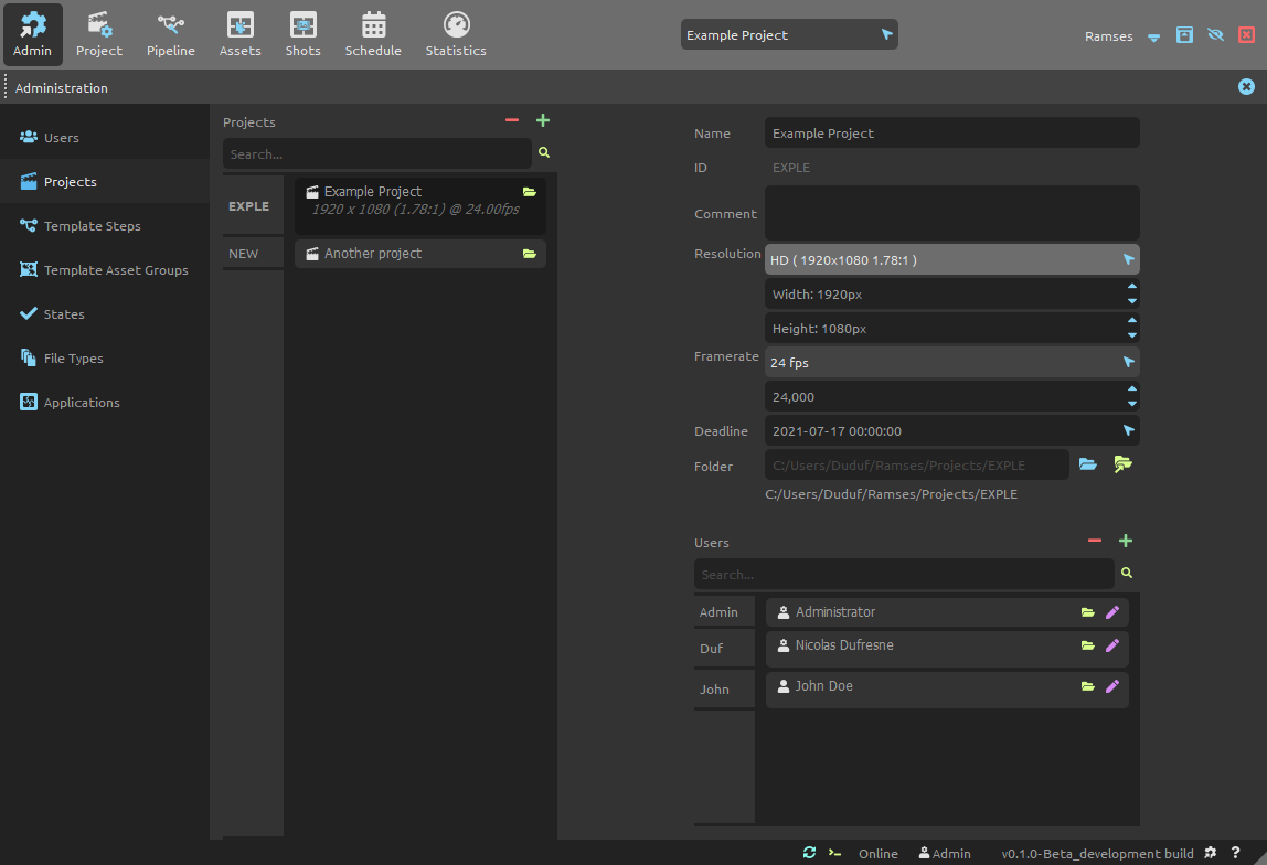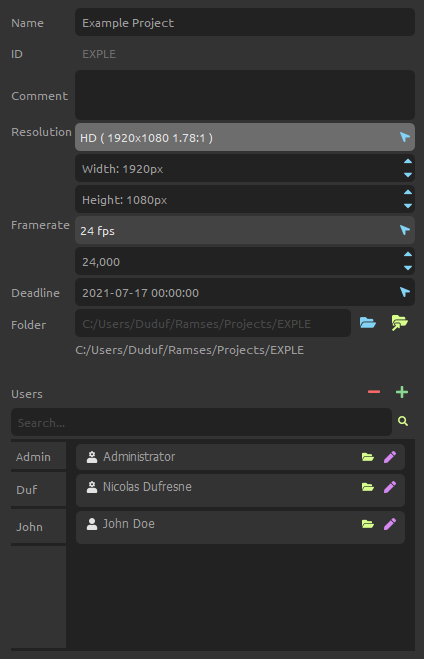 - ID is the unique identifier which is used in the files and folders (see Ramses Tree). It can’t be changed after the project folder has been created. Read the Ramses naming conventions to learn how IDs and names have to be formatted.