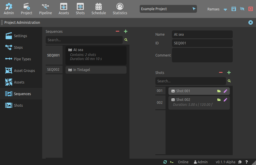This panel is used to list and manage all the sequences of the project. Sequences are used to help you sort and filter the shots of the project. They’re not used in the Ramses Tree.