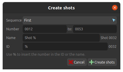 The creation button also allows you to create multiple shots at once and opens the following dialog: