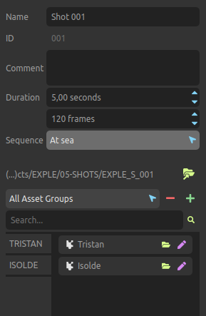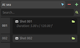 The list on the left lists all the shots of the project, and you can use the Search field to filter them by name or ID. The top selector filters the shots according to their containing sequence.
