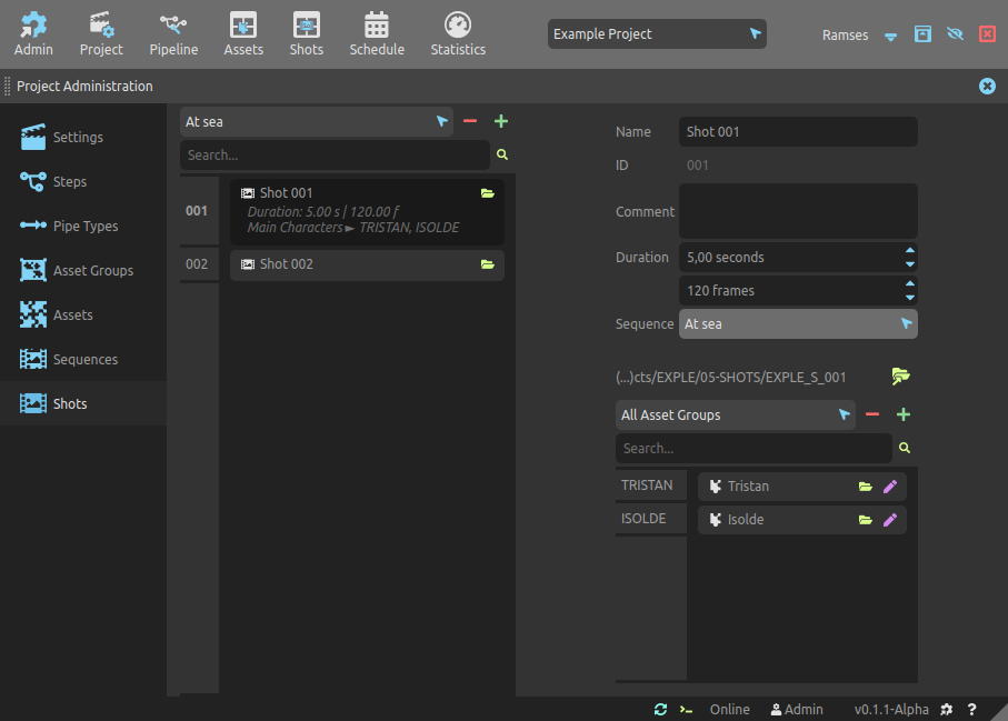 - The Duration of the shot can be set either in seconds or frames. Ramses uses the project framerate to update the other value.