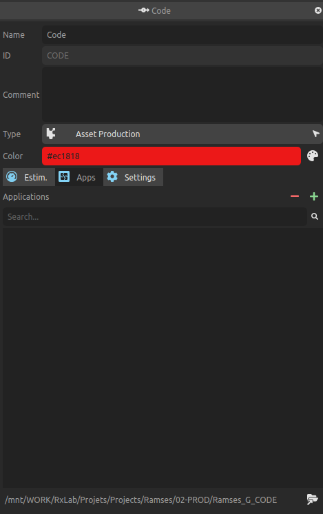 - Applications can be assigned to each step; this information is used by the pipeline tools for automations and to open files.