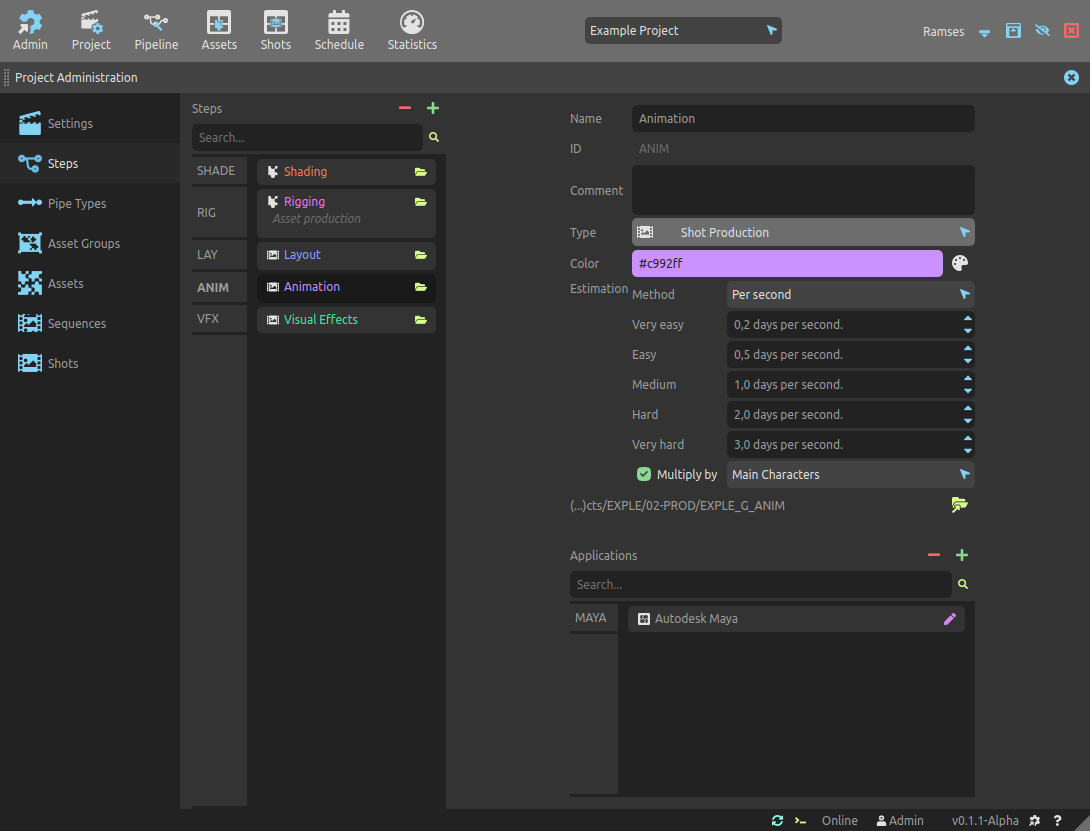 Ramses comes with a set of template steps, but they can be completely adjusted to any production needs; for example, if you consider Character Desgin to be a pre-production step instead of an asset production step, it’s up to you to customize the templates.